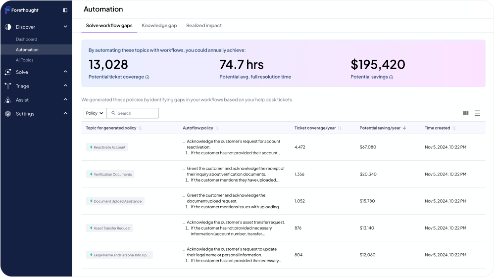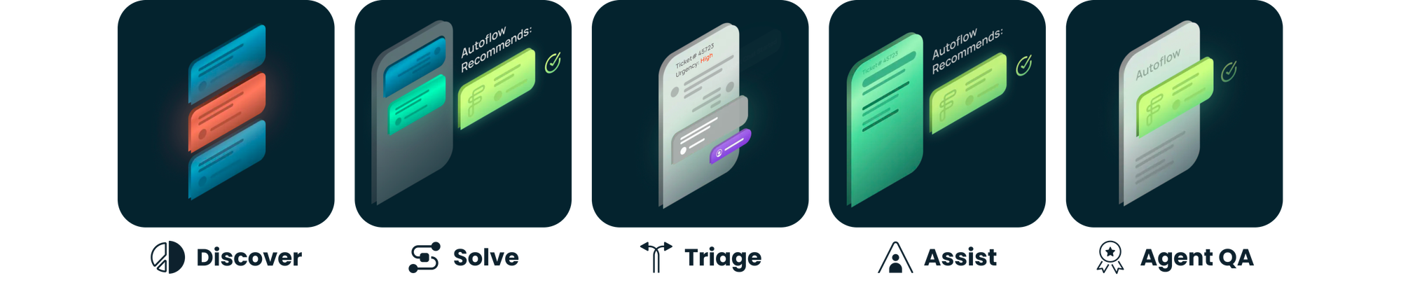 Discover is the intelligence layer. It connects to your helpdesk, knowledge base and CRM on day one and analyses historical ticket data. It surfaces trending issues, top contact drivers and emerging support patterns. More importantly, it identifies knowledge gaps and then auto-generates both articles and Autoflow workflows to fill them.