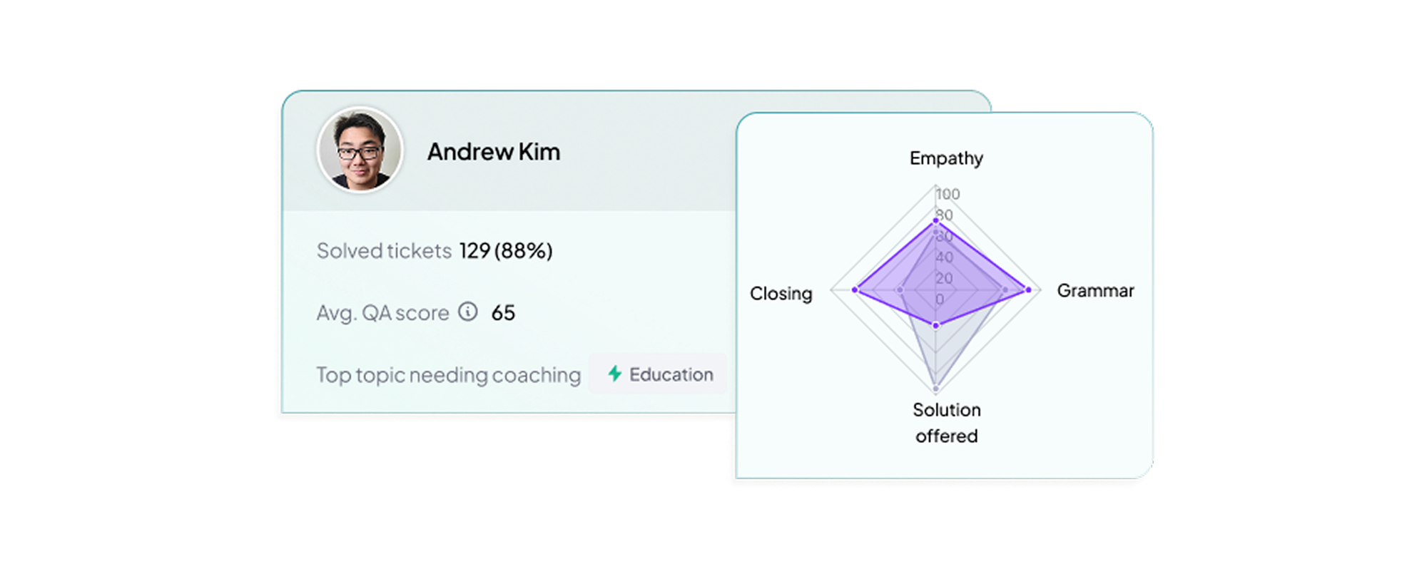 This is the area of closest parity. Both Forethought's Agent QA and Zendesk QA (from the Klaus acquisition in early 2024) do the same core thing: read 100% of conversation and score them on customisable metrics like resolution quality, technical accuracy, empathy and grammar. Both support custom scorecards. Both give agents performance dashboards and managers coaching insights.