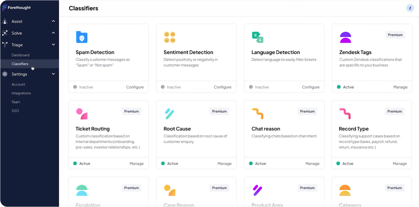 This maps closely to Zendesk's Intelligent Triage combined with Omnichannel Routing. The capabilities are broadly similar. Both detect intent, sentiment and language. Where Forethought differentiates is in custom model building. Where Intelligent Triage has its Entities, with Triage users can train their own classification models for specific business taxonomies, for example by product type and region. The other edge is tighter integration. Triage sits inside the same system as Solve and Assist, so the handoff from AI to human is a single chain rather than a transition between separate products.