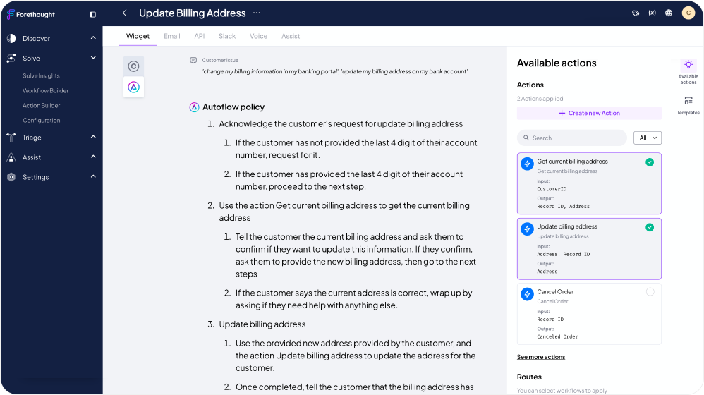 Solve is Forethoughts' customer facing AI agent. It handles end-to-end ticket resolution across chat, email, voice, SMS, Slack, mobile and API. It's powered by Autoflows, which we'll get into in the next section. It detects intent, executes actions like processing refunds or updating accounts via API, and deploys identically across all channels from a single workflow definition.