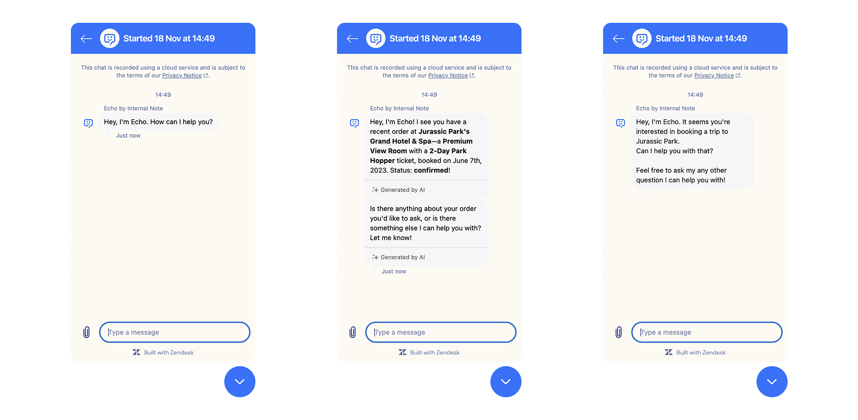 Imagine a customer visiting your theme park website. They booked tickets two days ago, or they’re about to visit next week. Instead of greeting them with a generic “How can I help?”, your AI Agent could retrieve that order, acknowledge the booking, and offer tailored help, before they even start asking questions.