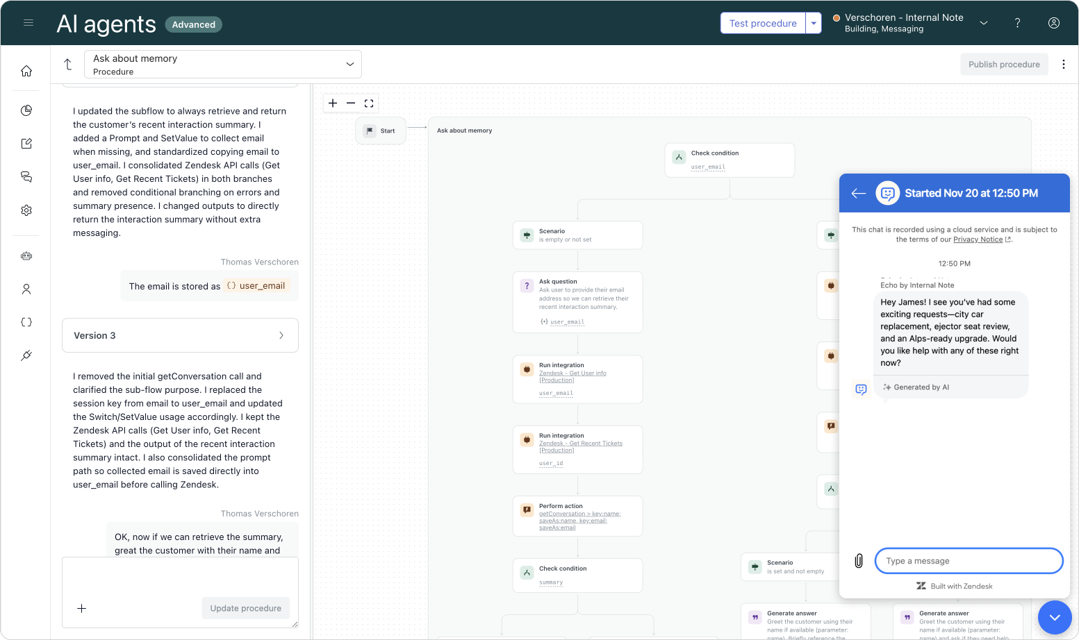Zendesk’s AI Agents don’t yet maintain that conversational memory across interactions. Each conversation is still handled as a standalone moment. However, we can already simulate parts of this using Agent Copilot summaries, APIs, and procedures.