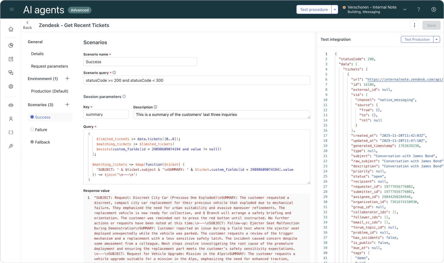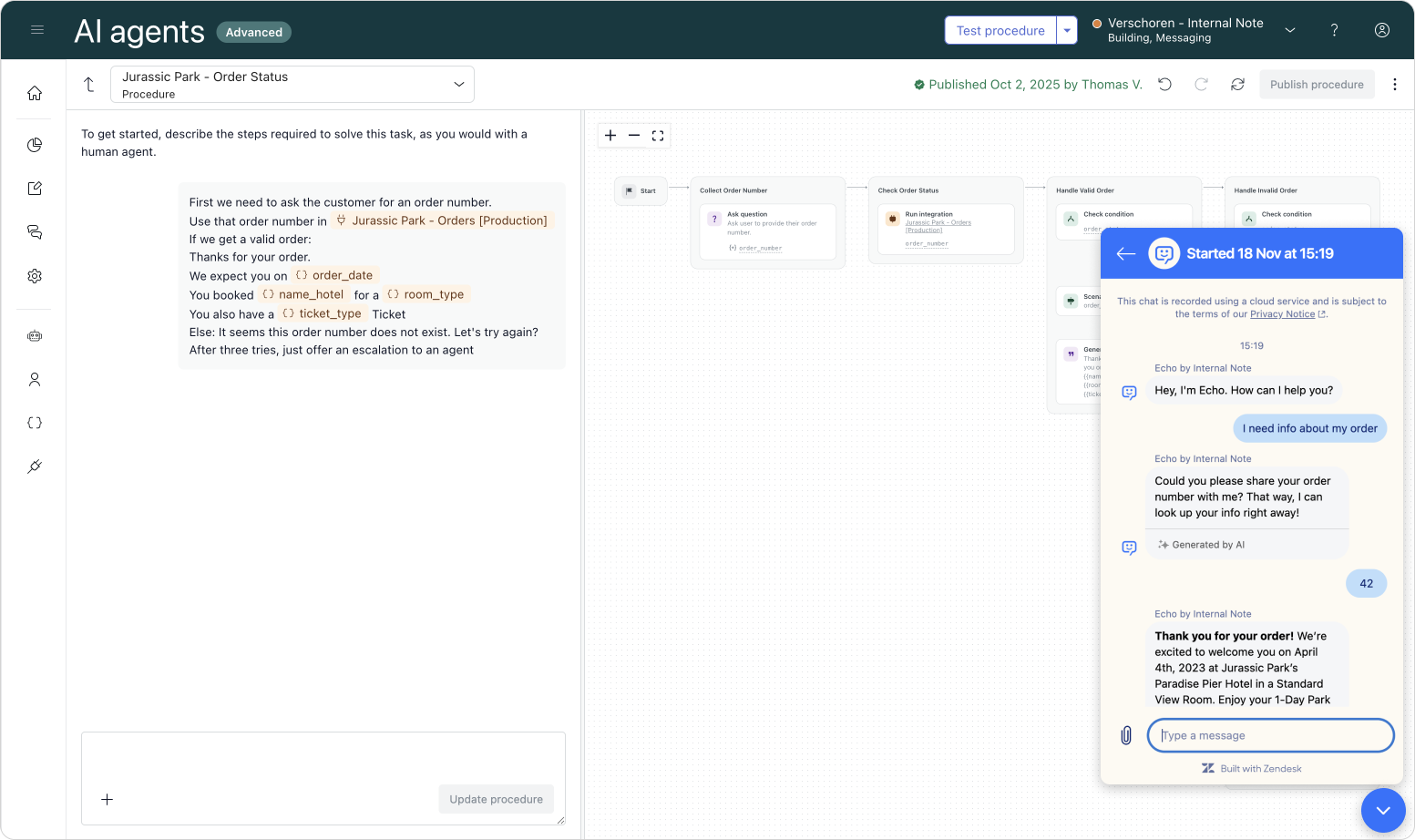 That’s where use cases, procedures, and actions come into play in AI Agents Advanced. Here, you can define structured workflows that allow the AI Agent to gather context, call APIs, access systems, and complete tasks and pass the results to the customer. The agent can either complete the request fully, or act as a concierge by collecting the right information and routing it to the right team.
