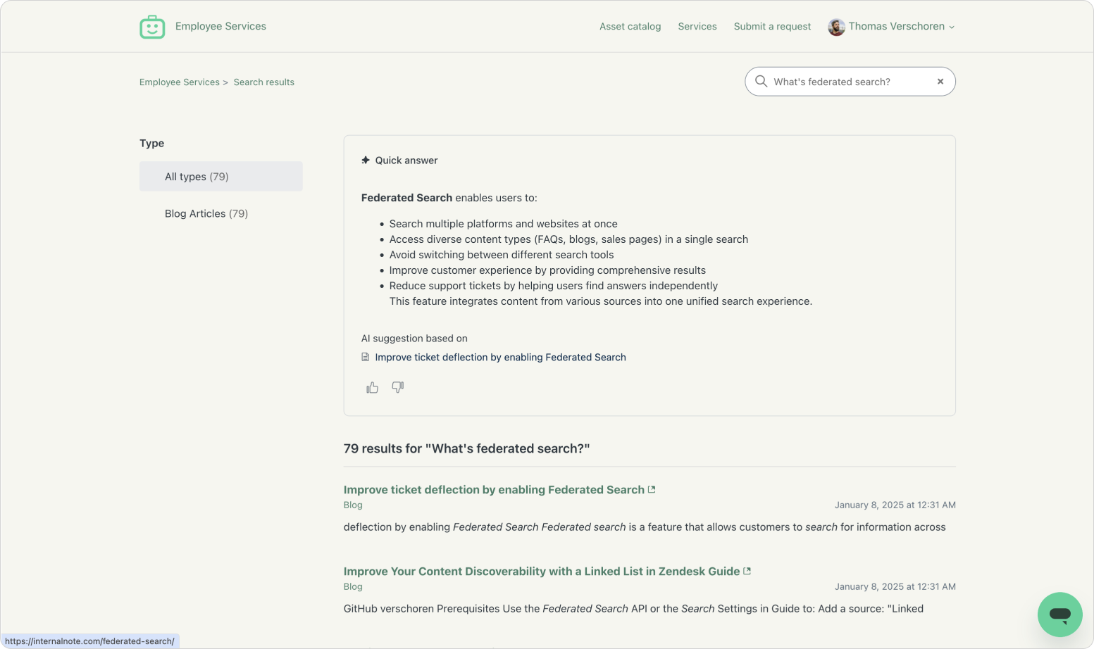 AI Agents apply that same content in live conversations, enriched with data from Federated Search, web crawlers and connected knowledge sources like Confluence.