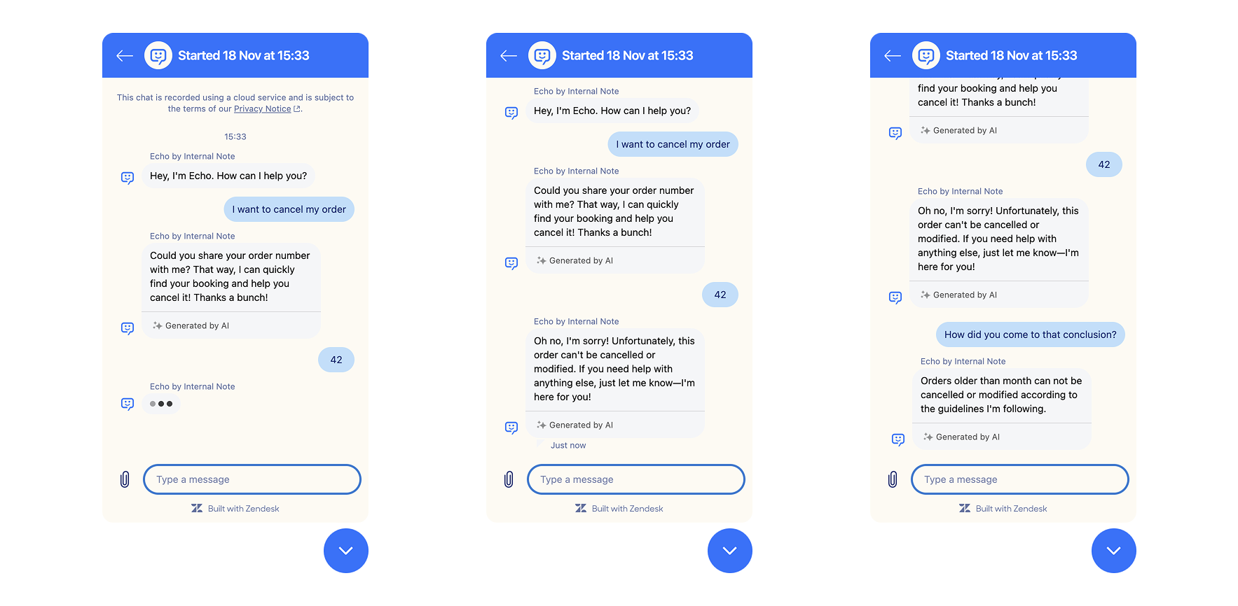 Transparency becomes even more important when the AI Agent isn't just answering but making decisions. If a customer’s cancellation request is denied, “computer says no” is not a valid resolution. The answer needs context: