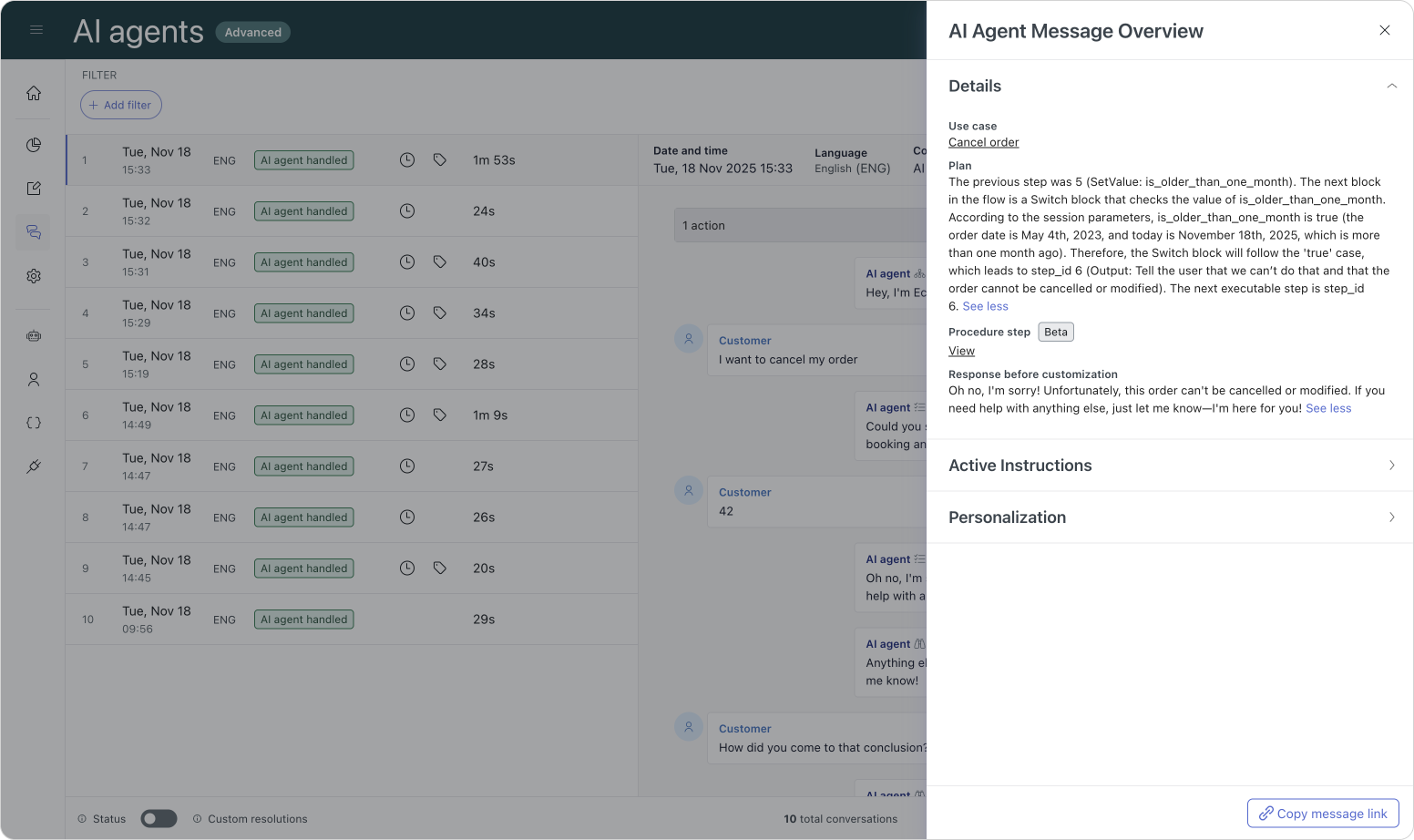 In AI Agents Advanced, conversation logs show how the system interpreted each message, which branch of the procedure it followed, what API returned which data, and ultimately why it produced that answer. You can see where the logic held up and where it didn’t.