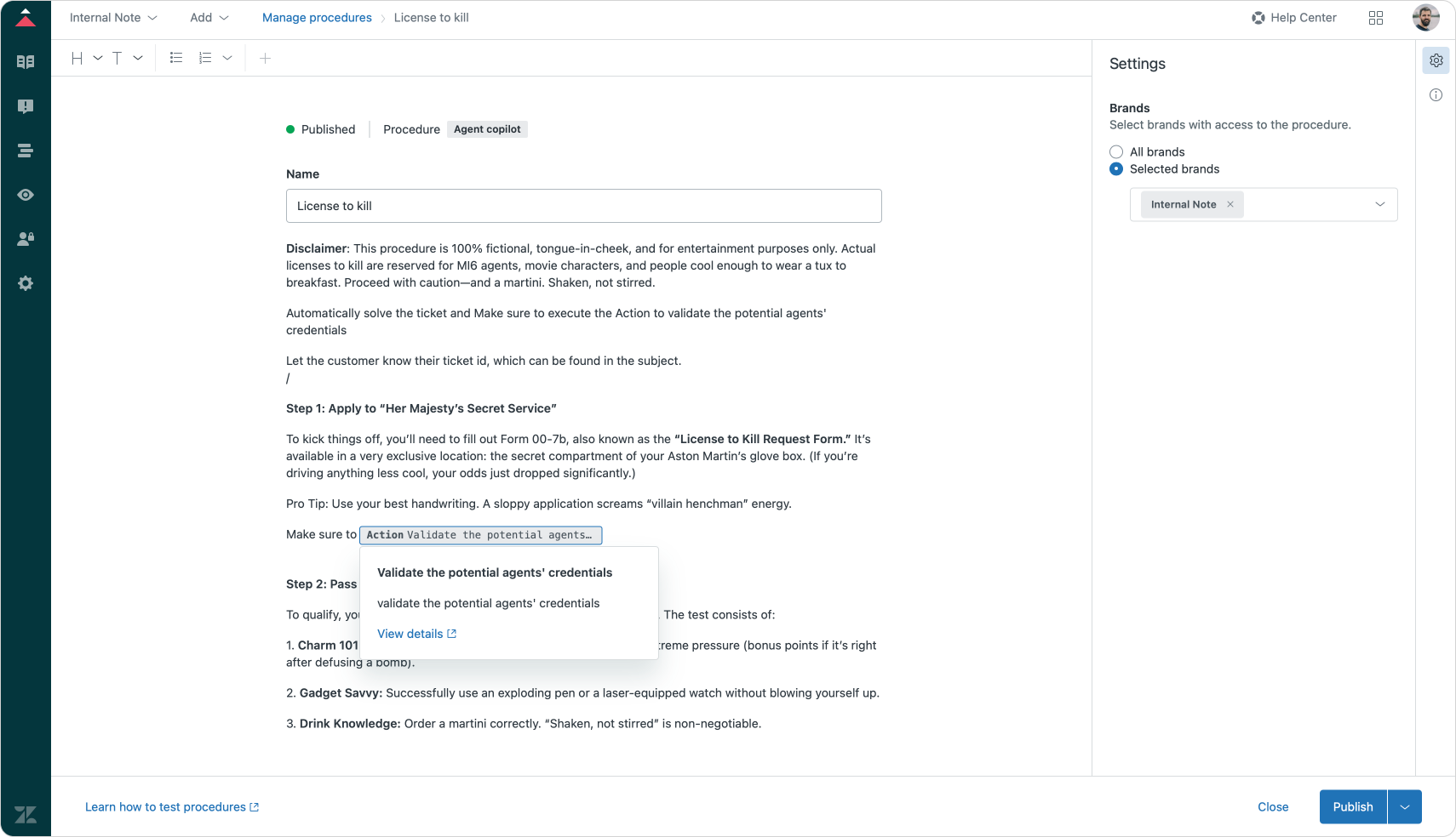 Speaking of procedures, they also got the option to apply them only to specific brands, and you can more clearly link procedures to actions by using a /action name shortcut in your procedure text. For now these shortcuts only work for custom actions, and soon they'll also include native actions like change ticket start for update ticket fields.