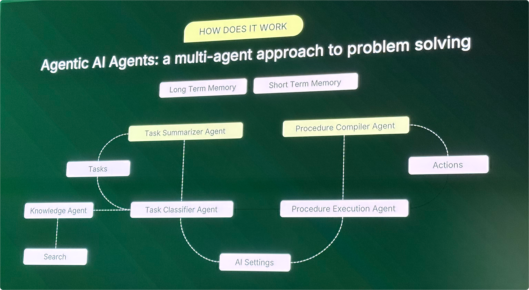 - Procedure execution agent: Carries out actions by calling APIs, triggering workflows, and updating systems, all within the logic defined by the business.