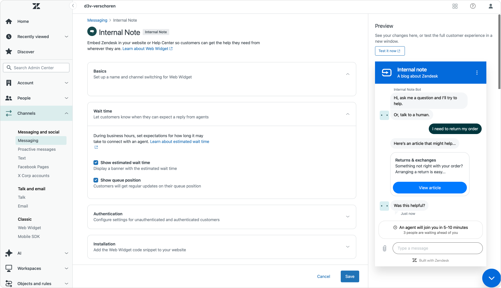Last year Zendesk announced the ability to show conversation wait time as part of a customer conversation via Messaging Triggers. This worked nicely but was a bit clunky to set up. Now this feature has been moved to a native setting for Messaging channels, showing customer wait time and, optionally, queue length as a modal banner at the bottom of your Messaging widget or mobile SDK.