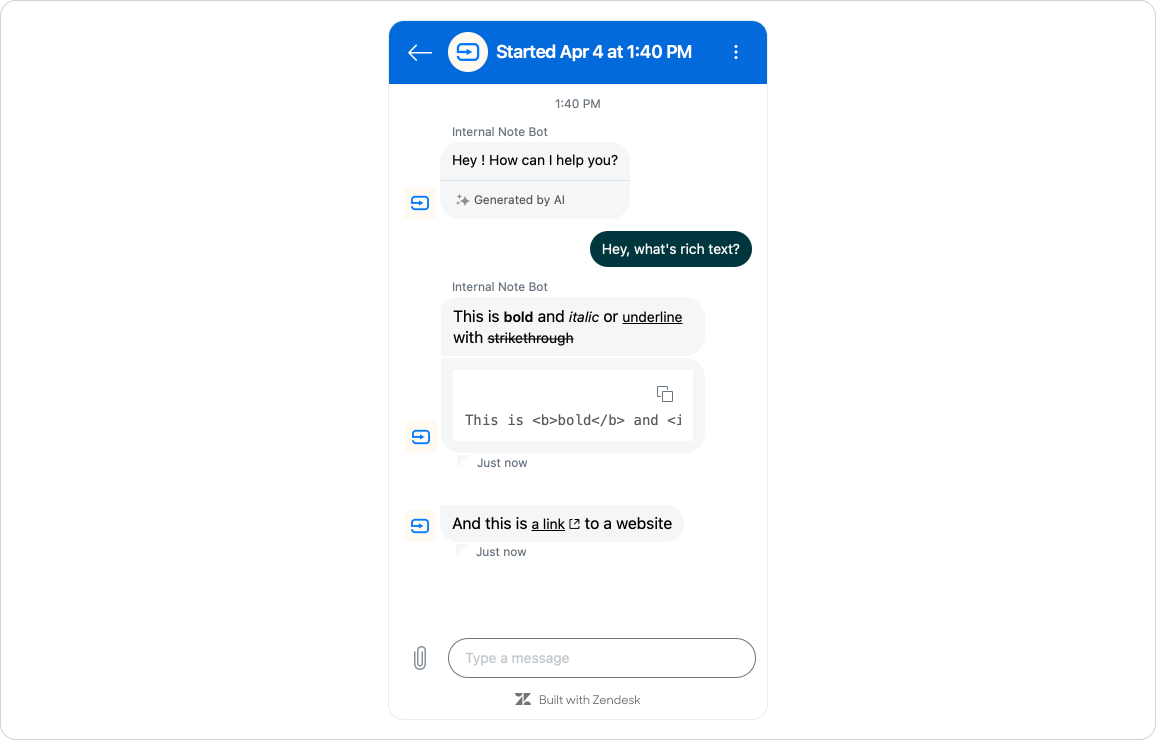 Rich text messages allow you to send messages with text formatting, including bold, italic, underline,strikethrough, and more. You can also include links in your messages, or even format them using a subset of HTML.