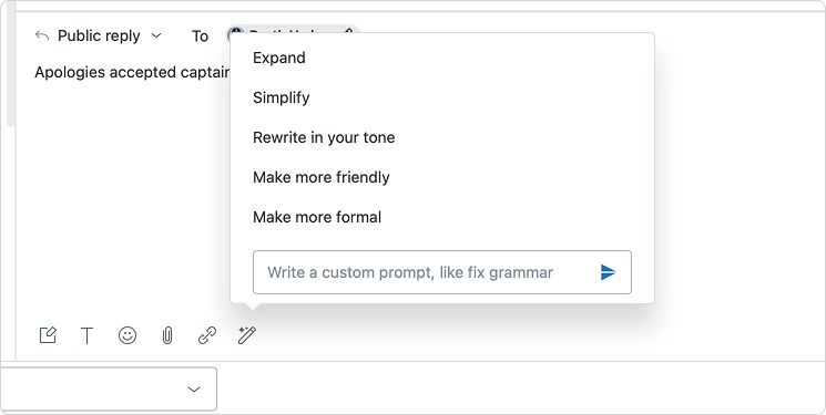 Similarly, the writing tools got a Simplify option, which makes long text easier to grasp. You can rewrite comments based on an agents' existing tone of voice in other comments, or you can prompt the reply field to write something specific like summarize, or convert to bullet points or translations.