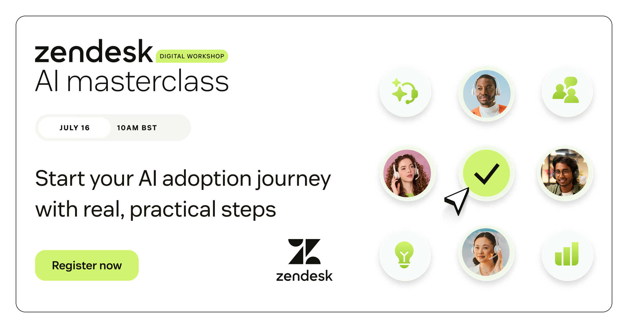 Zendesk is launching AI Masterclass to arm you with the expert guidance and customer-led stories you need to successfully adopt AI, implement AI agents, and scale impact across your CX organization.