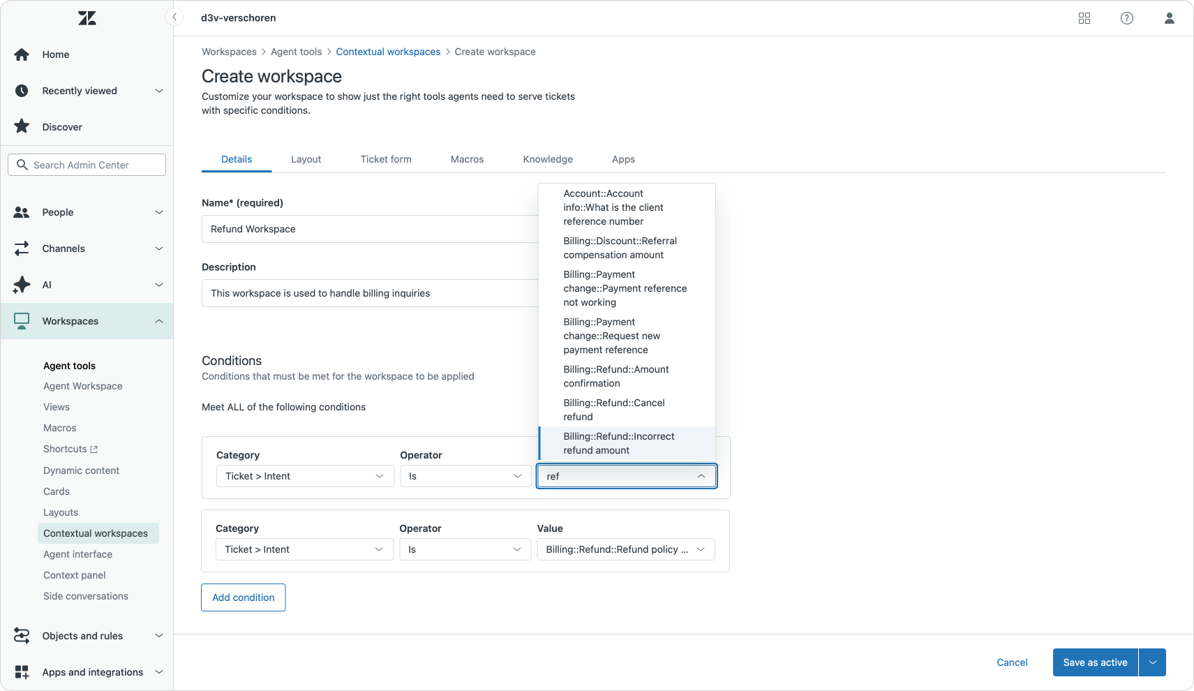 Until now, contextual workspaces primarily supported configurations based on specific ticket fields. Now you can now define conditions based on AI fields—Intent, Sentiment, and Language—along with custom ticket fields.
