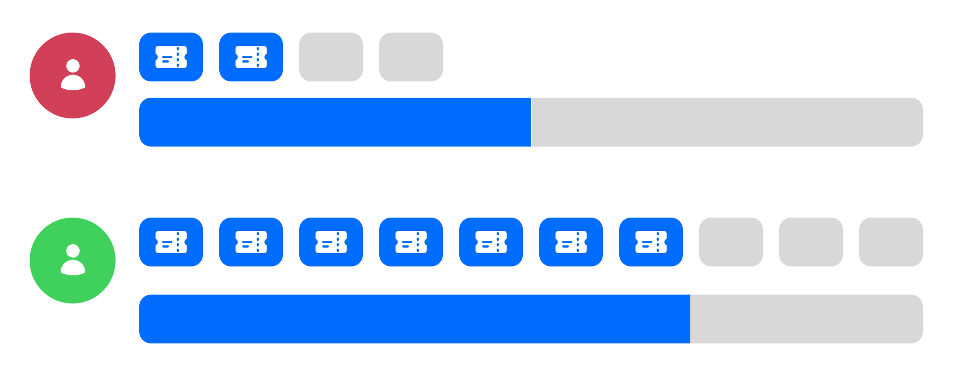 - The green agent has a capacity of 10 and has 7 tickets assigned.
