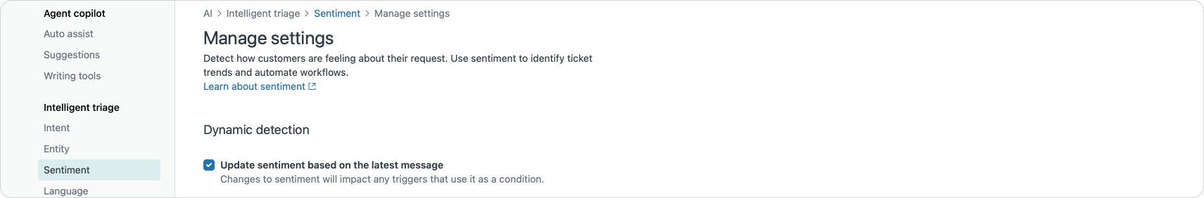 Zendesk is pleased to announce that customers using intelligent triage will have the ability to track sentiment and intent throughout the ticket lifecycle. By tracking end users’ predicted sentiment and intent throughout the ticket lifecycle, you can spot trends and address issues early, preventing escalations.