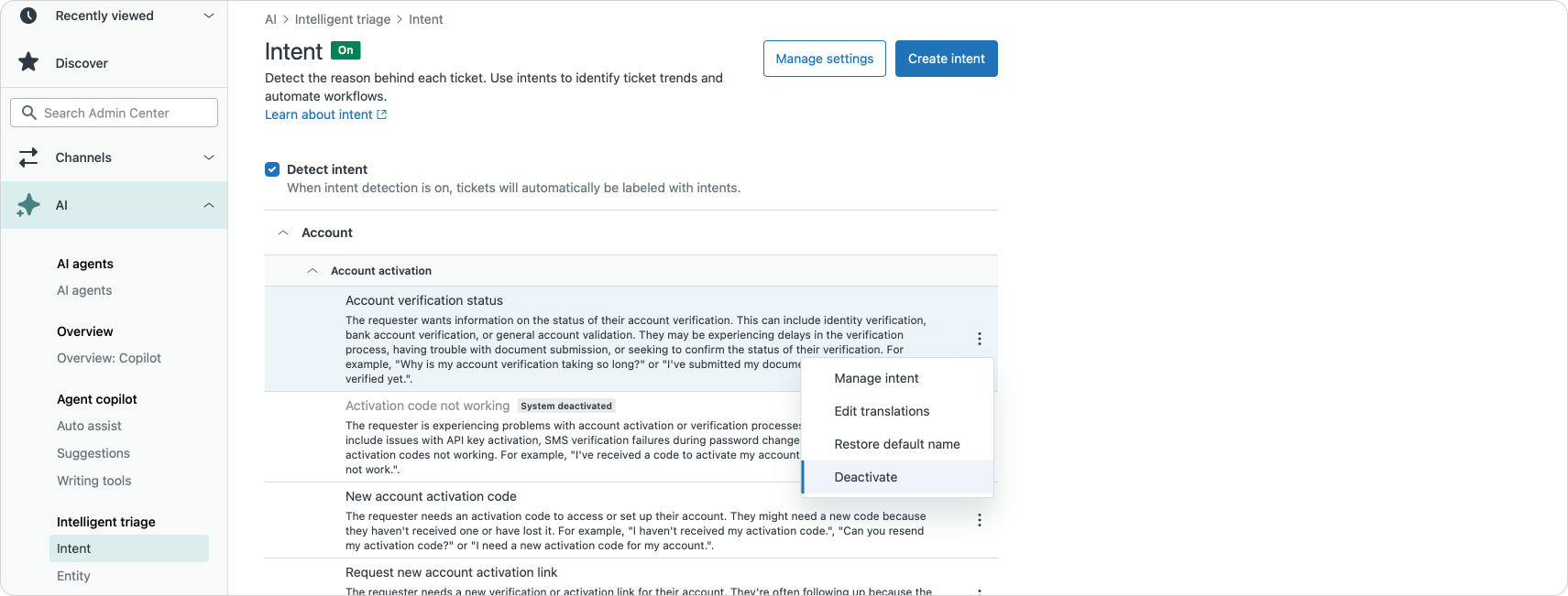 But now that's a thing of the past it seems. Zendesk has just released a new generic model that works across all industries. And thanks to the recently released deactivation option for intent, you can filter this longer list of prebuilt intents to just the ones applicable to your use case.