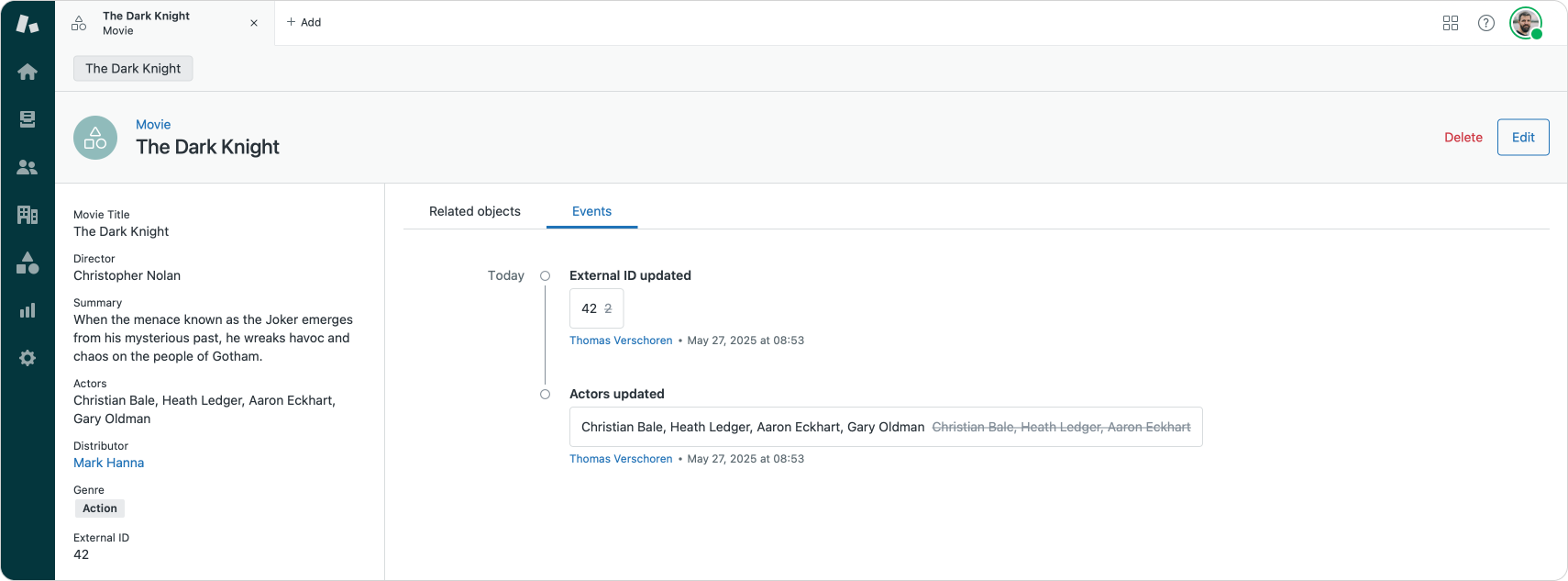 The Custom Objects record viewer now displays a new Events tab that shows all changes made to an object, giving you a clean overview of what happened to a record.
