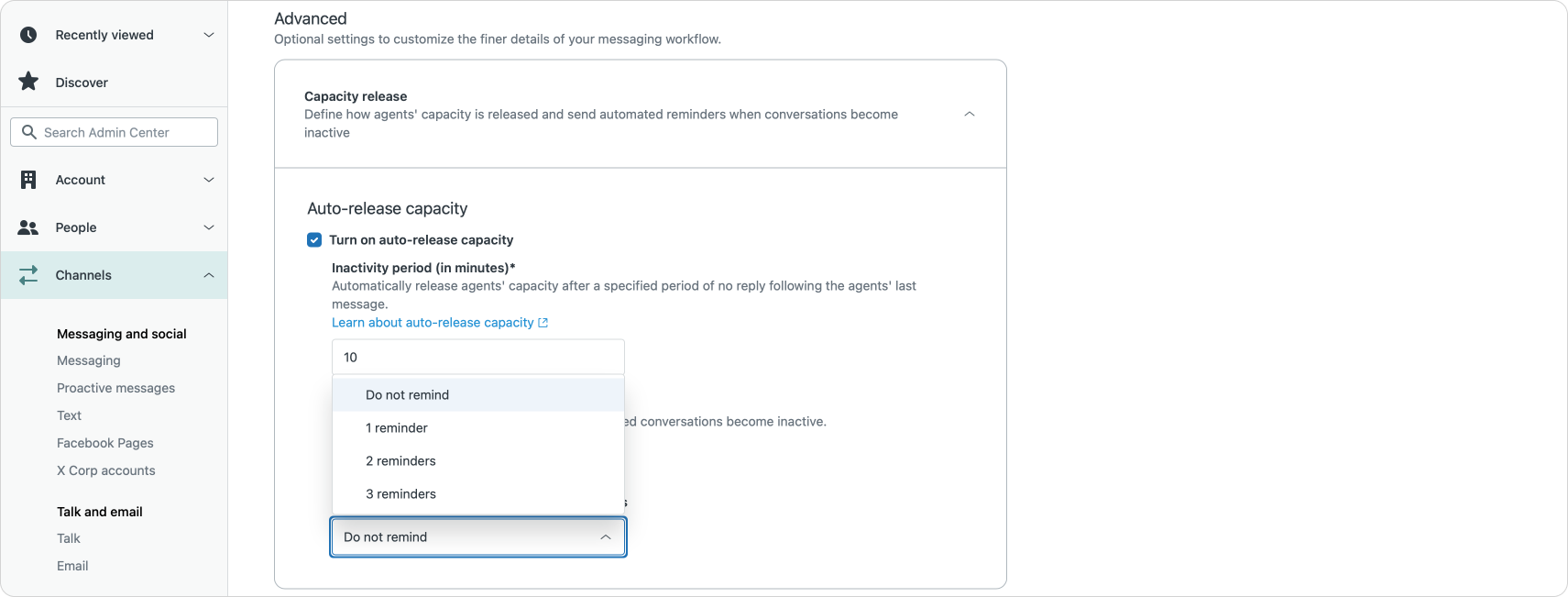 We are adding automatic reminders to the capacity release feature in messaging, which lets you send up to three nudges to end users, encouraging them to respond to the inactive conversation, and resolves the ticket if no response is received.