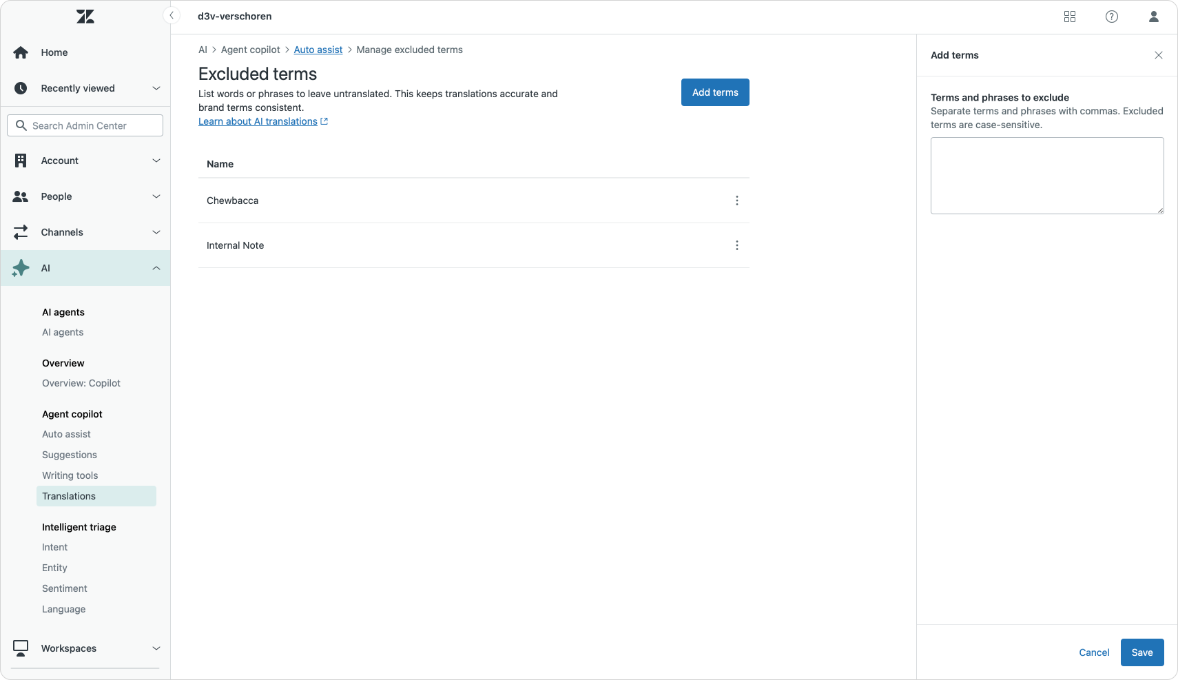 The new Excluded terms option for AI translations solves this by allowing you to add a list of words that should never get translated by the system.