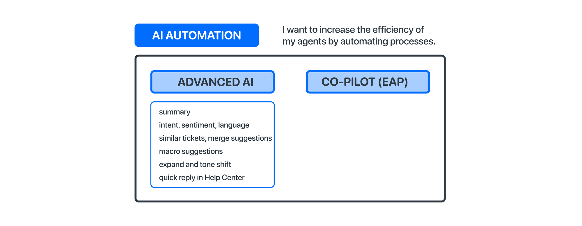 Of course, the elephant in the room is the newly announced AI Copilot. Only available in EAP it promises to automate a lot of the actions agents normally do themselves, and will, if Zendesk's vision comes true, turn agents into approvers and editors, instead of the ones actually doing the job. However, since this article is about what's possible today, and to stay in line with the good advice of 'buy for the features that are here now, not the once that are promised), it's best to validate the product fit of Advanced AI based on the features mentioned in the first few paragraphs.