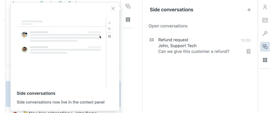 With the arrival of Layout Builder, side conversations also got an upgrade. The feature has moved from the top of the ticket view to its own dedicated context panel. This move has been enabled for all environments, but annoyingly requires admins to confirm the setting in the admin center first before it's usable, even if the feature has already moved.